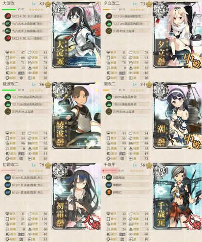 ラストダンスでいろいろ編成試してたらバケツ70個くらい消えましてね……。昼戦火力捨てて駆逐4にしたらあっさりクリアですよ、ええ(白目)。 駆逐艦はキラ付けしとくといいかも。面倒臭いのでやりませんが。ちなみに大淀さんの夜偵はただの飾りでした。 道中…