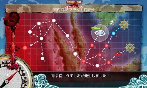 南シナ海から空母機動部隊でうずしおを通過しつつ重巡夏姫の待つインド洋へ。 Kは夜戦。燃料ペナルティがないので大破撤退率はそんなに高くない。とは言えケツダイソンからのカットインが突き刺さればワンパン大破。ここで護衛退避を使いつつボスまで行くと…